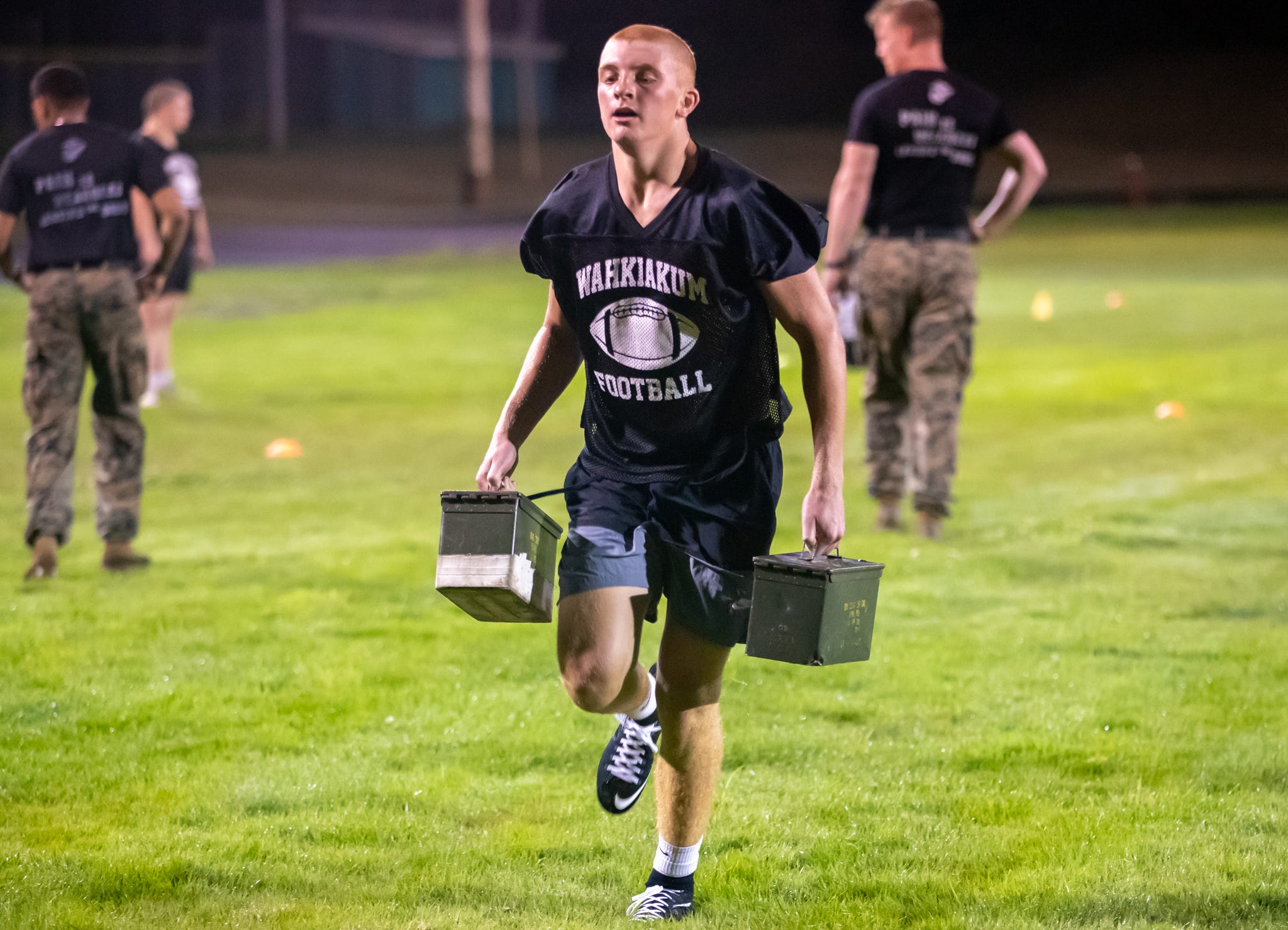 — Wahkiakum football players are pushed through the paces of a midnight workout by members of the United State Marine Corps on Wednesday, Aug. 20, in Cathlamet. The midnight practices have become a first-day-of-the-season tradition for the Mules, who also enjoy some of the finest grass turf gridirons in all of Washington. / Video by Skyler Smith for Blast Zone Media